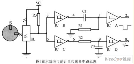 4.2 实现方法 双磁铁采用非对称安装,其中一个磁铁的s极朝外,另一个N极朝外,参见图3。假设s极置位霍尔传感器HL,N极复位传感器,显然磁极顺时针和逆时针分别掠过HL时,输出脉冲宽度不同。电路中IC为六施密特触发器,IC—B和IC—C将HL的输出信号反相并分为两路信号,一路输入到由R1、C1与IC—A构成的微分电路,输出计量脉冲。另一路输入到由R2、C2与IC—D构成的积分电路。合理选取R2、C2参数,使积分电路对宽脉冲能够积分到IC—D的输入门限电压,而对窄脉冲则不能。显然磁铁逆时针转动时IC—D输出高电平,顺时针旋转时IC—D输出低电平。采样轮的正反转得到判断,并输出可逆计量控制电平。