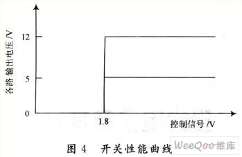 场效应管选择了增强型P沟道场效应管IRF9640和增强型N沟道场效应管VN2222L。以场效应管IRF9640作为开关管来控制电路的通和断,以场效应管VN2222L作为开关控制管来控制场效应管IRF9640的开和关。当控制信号输入端输入高电平时,开关电路导通;当控制信号输入端输入低电平时,开关电路断开。经过试验测得:当控制信号电压从0 V逐渐上升到1.8 V时开关导通;当电压从高电平(如3.3 V)逐渐下降到1.8 V时开关断开。此开关电路的性能如图4所示。