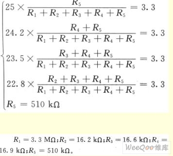 电池电压取样电阻网络是通过取样电阻的组合对电池的输出电压进行分压取样,各电阻端点对应的电池电压状态值分别为:R2对应22.8 V,R3对应23.5 V,R4对应24.2 V,R5对应25 V。当电池输出的电压值等于各个电阻设定的状态值时,则该电阻端取样电压为3.3 V;当电池输出的电压值大于各个电阻设定的状态值时,则该电阻端取样电压大于3.3 V;当电池输出的电压值小于各个电阻设定的状态值时,则该电阻端取样电压小于3.3 V。取样电阻R1,R2,R3,R4,R5的取值可由下面的方程组求得:
