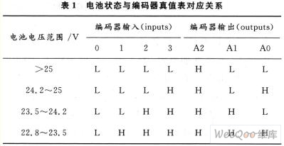 编码器74HCl48低电平有效,所以在比较器LMl39的后面又接了反相器74HC04,编码器输入/输出的二进制码(真值表)与电池电压的关系如表1所示。