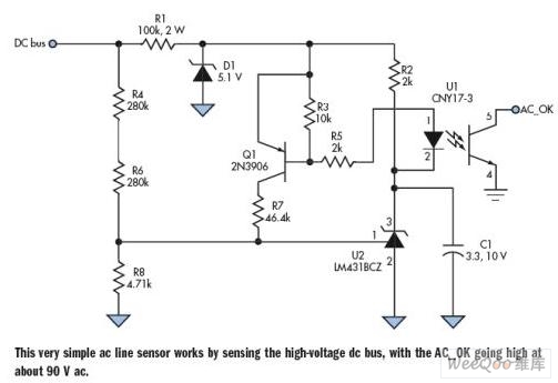 R1和D1产生5.1V偏压,该偏压使本电路可以自供电。为了尽量降低R1上的功耗,选择其他电阻,使电流最小。U2为LM431BCZ,用作参考和比较器。Q1和R7用来产生滞后,避免在分界点附近振动。由于关断后LM431仍拉电流,所以使用Q1的基极电流驱动U1,保证U1中没有电流流过。C1将可能影响U1的噪声滤除。R4和R6感测电源的直流总线。使用两个电阻,使耗散达到1/4瓦。