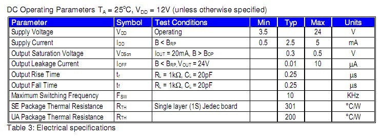 器件集成了电压调节器,动态偏差补偿系统的霍尔传感器,施密特触发器和开漏输出驱动于一个封装内。
