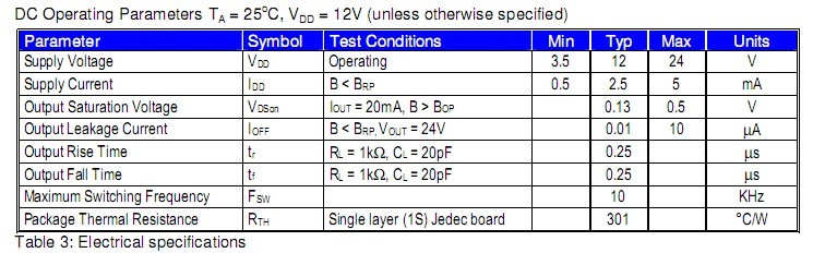 器件集成了电压调节器,动态偏差补偿系统的霍尔传感器,施密特触发器和开漏输出驱动于一个封装内。