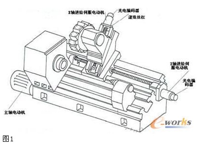 在图1中,X轴和Z轴端部分别配有光电编码器,用于角位移测量和数字测速,角位移通过丝杠螺距能间接反映拖板或刀架的直线位移。