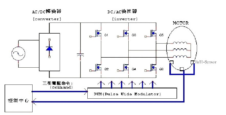 电源部可以直接以直流电输入(一般为24V)或以交流电输入(110V/220 V),如果输入是交流电就得先经转换器(converter)转成直流。不论是直流电输入或交流电输入要转入电机线圈前须先将直流电压由换流(inverter)转成3 相电压来驱动电机。换流器(inverter)一般由6 个功率晶体管(Q1~Q6)分为上臂(Q1、Q3、Q5)/下臂(Q2、Q4、Q6)连接电机作为控制流经电机线圈的开关。控制部则提供PWM(脉冲宽度调制)决定功率晶体管开关度及换流器(inverter)换相的时机。直流无刷电机一般希望使用在当负载变动时速度可以稳定于设定值而不会变动太大的速度控制,所以电机内部装有能感应磁场的霍尔传感器(hall-sensor),做为速度之闭回路控制,同为相序控制的依据。但这只是用来做为速度控制并不能拿来做为定位控制