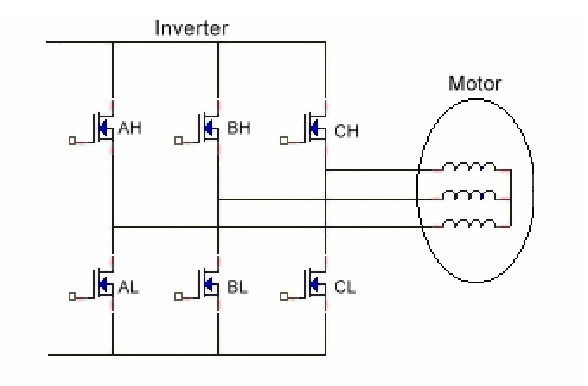 要让电机转动起来,首先控制部就必须根据hall-sensor 感应到的电机转子目前所在位置,然后依照定子绕线决定开启(或关闭)换流器(inverter)中功率晶体管的顺序,如下(图二) inverter 中之AH、BH、CH(这些称为上臂功率晶体管)及AL、BL、CL(这些称为下臂功率晶体管),使电流依序流经电机线圈产生顺向(或逆向)旋转磁场,并与转子的磁铁相互作用,如此就能使电机顺时/逆时转动。当电机转子转动到hall-sensor 感应出另一组信号的位置时,控制部又再开启下一组功率晶体管,如此循环电机就可以依同一方向继续转动直到控制部决定要电机转子停止则关闭功率晶体管(或只开下臂功率晶体管);要电机转子反向则功率晶体管开启顺序相反。