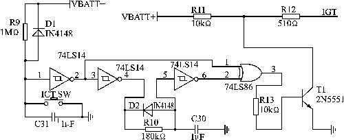 对于TC35i模块控制,IGT信号非常重要,只有正确的IGT信号才可以使TC35i模块正常运行。系统加电后,为使TC35i 进入工作状态,必须给IGT 加一个延时大于100 ms 的低脉冲,电平下降持续时间不可超过1 ms。驱动IGT时,TC35i 供电电压不能低于3.3 V ,否则TC35不能激活。电路设计如图3所示。启动电路由开漏极三极管和上电复位电路组成。为保证整个系统正常启动,要求在电源加电时,IGT必须保持大于100 ms的低电平后,再跳到高电平,在电路板中是依靠RC电路来完成的,且该信号下降沿时间小于1 ms。启动后,IGT脚的信号应保持高电平。电源通电后,+5 V电源通过电阻对电容充电,使电容正极上的电压慢慢上升,大约经过100 ms达到高电位,使施密特触发器翻转,系统被复位。启动后, IGT应保持高电平(3.3 V) 。