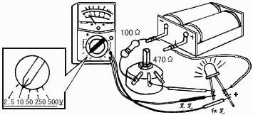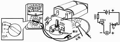 (4)将万用表串接在断点处。红表笔接发光二极管负极,黑表笔接电位器中间接点引线。这时,发光二极管重新发光。万用表指针所指刻度值即为通过发光二极管的电流值。