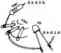 器材 电池二节(放在电池盒中)100fll/8W固定电阻,470t1电位器、发光二极管、导线、万用表。