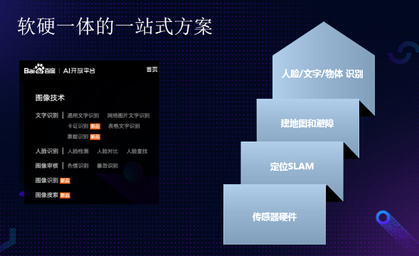 他表示,“不同于市面上所有别的机器人视觉模组,百度机器人视觉是市面上唯一既有导航定位(SLAM),也有物体识别(人脸识别、物品识别、OCR识别)的机器人视觉 SDK,并且是唯一软硬件都开源的视觉模组。”目前,百度机器人视觉已经在百度AI开放平台开放试用,开发者可体验这一软硬一体的机器人视觉技术解决方案。