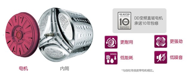 另外,DD电机技术的出现打破了滚筒比波轮耗电的常规,DD直驱技术改变了以往用皮带作为介质的运转方式,而用电机直接驱动,使电机效能达到传统电机的16倍,节能35%左右。同时DD直驱电机去掉了皮带、皮带轮等部件还解决了滚筒洗衣机震动大、噪音大的难题。