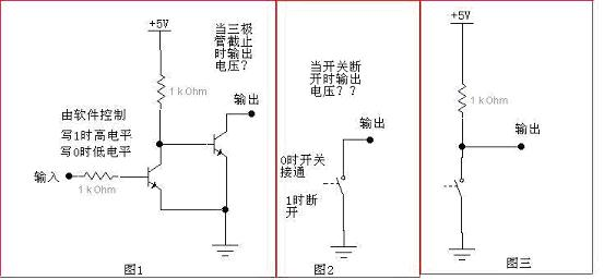 再看图三。图三中那个1K的电阻即是上拉电阻。如果开关闭合,则有电流从1K电阻及开关上流过,但由于开关闭和时电阻为0(方便我们的讨论,实际情况中开关电阻不为0,另外对于三极管还存在饱和压降),所以在开关上的电压为0,即输出电平为0。如果开关断开,则由于开关电阻为无穷大(同上,不考虑实际中的漏电流),所以流过的电流为0,因此在1K电阻上的压降也为0,所以输出端的电压就是5V了,这样就能输出高电平了。但是这个输出的内阻是比较大的(即1KΩ),如果接一个电阻为R的负载,通过分压计算,就可以算得最后的输出电压为5*R/(R+1000)伏,即5/(1+1000/R)伏。所以,如果要达到一定的电压的话,R就不能太小。如果R真的太小,而导致输出电压不够的话,那我们只有通过减小那个1K的上拉电阻来增加驱动能力。但是,上拉电阻又不能取得太小,因为当开关闭合时,将产生电流,由于开关能流过的电流是有限的,因此限制了上拉电阻的取值,另外还需要考虑到,当输出低电平时,负载可能还会给提供一部分电流从开关流过,因此要综合这些电流考虑来选择合适的上拉电阻。