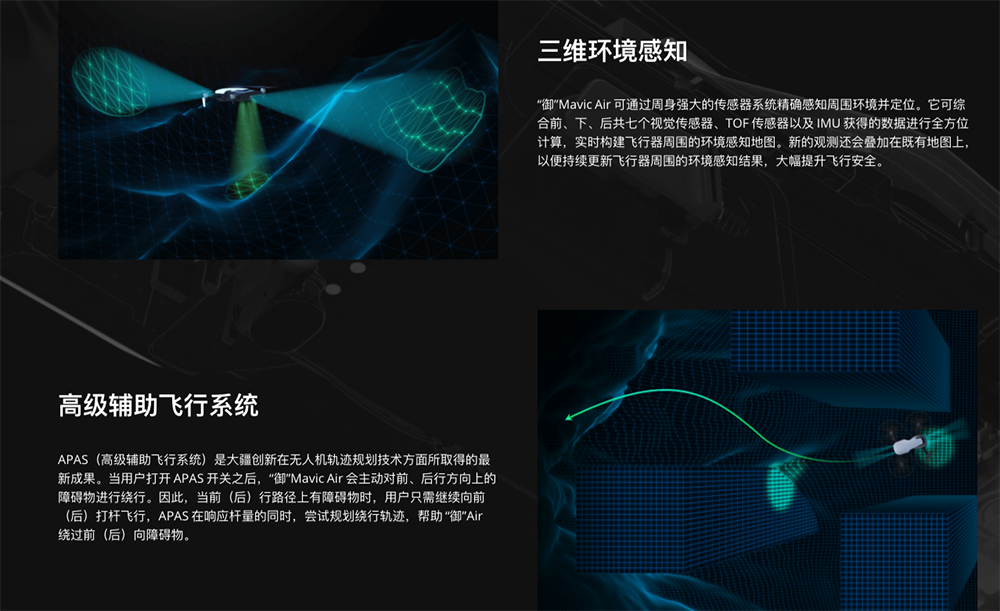 既然单目摄像头已经能满足 VIO 的需要,可想而知 Mavic Air 的三维环境感知能力有多强。采用了 VIO 技术的 Mavic Air 可以在无 GPS、高速飞行的条件下实现精准定位。得益于机内实时构建的 3D 环境地图,高级辅助飞行系统也成为了现实。当用户打开 APAS 开关之后,Mavic Air 会主动对前、后行方向上的障碍物进行绕行。因此,当行路径上有障碍物时,用户只需继续向对应方向打杆飞行,APAS 就会自主尝试规划绕行轨迹,帮助 Mavic Air 绕过前后障碍物。