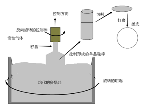为了形成单晶硅,还需要控制晶体的方向,坩埚带着多晶硅熔化物在旋转,把一颗籽晶浸入其中,并且由拉制棒带着籽晶作反方向旋转,同时慢慢地、垂直地由硅熔化物中向上拉出。