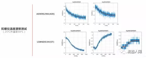 上面是一个陀螺仪温度漂移测试结果图,测试的环境是从25℃升温至50℃,整个过程保持陀螺仪静止不动,陀螺仪的准确输出应该是一个固定的数值。但从结果来看,两款传感器的实际输出都受到温度变化影响。相比而言,ADXRS290(ADI)的输出数值变化幅度较小,基本上在0.5左右。