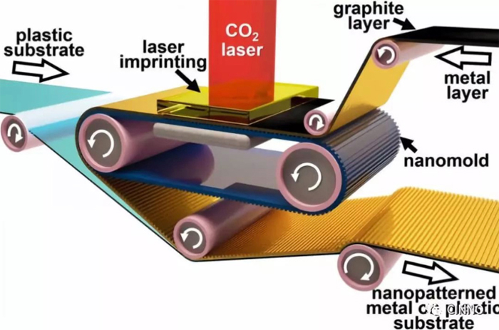 这种制造方法称为基于激光诱导超塑性的卷对卷加工工艺(Roll to Roll laser-induced superplasticity),它使用像高速打印报纸用的滚动压模版(Rolling Stamp)。该技术可以在短时间内通过应用高能激光照射诱导出各种金属的“超塑性”,这使得金属能够流入滚动压模版的具有纳米级特征的图案内– 这就绕过了“可成形性极限”。