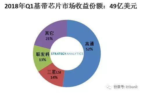 到了4G时代,呈现高通一家独大的格局。Strategy Analytics研究报告指出,2018年Q1,高通、三星LSI、联发科、海思和UNISOC(展讯和RDA)在全球蜂窝基带处理器市场中收益份额囊获前五。其中Q1高通继续以52%的基带收益份额保持第一;其次是三星LSI,占14%;联发科占13%。
