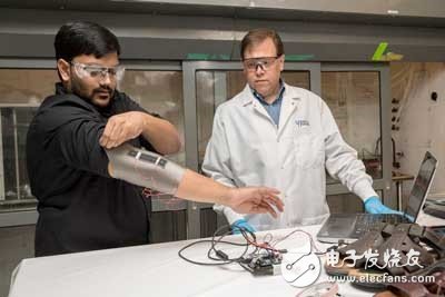 SagarDoshi(左)和埃里克·托斯滕森测试配备了他们的新型传感器的肘部袖子