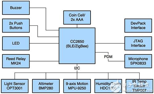 图 2:Texas Instruments SensorTag 利用 TI CC2650 无线 MCU 的无线通信及传感器处理的集成功能,为传感器应用的快速开发提供多个传感器和接口。 (资料来源: Texas Instruments)