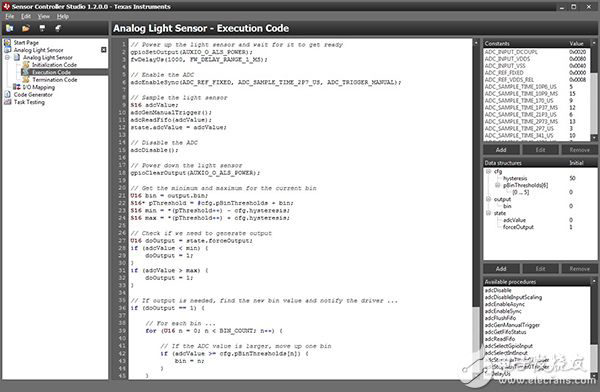 图 4:开发人员使用 TI Sensor Controller Studio 软件开发工具和类 C 语言对 CC2650 的集成传感器控制器引擎进行编程。 这会生成 C 源代码,以纳入专门在 CC2650 无线 MCU 上运行的主要应用中。 (图片来源: Texas Instruments)