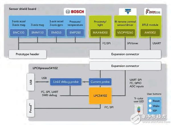 图 5:NXP 提供了一种传感器解决方案。该方案结合了 LPC54102 LPCXpresso 板与装载多个传感器的扩展板,以及包括完整传感器软件库的全套开发环境。 (图片来源: NXP)