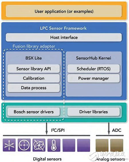 图 6:开发人员在 NXP 的 LPC 传感器框架上构建传感器应用,该框架提供全面的运行时间环境,包括系统服务和传感器信号处理,以及通过 Bosch Sensortec BSX Lite 库对传感器融合应用的内置支持功能。 (图片来源: NXP)