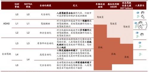 随着人工智能的蓬勃发展,自动驾驶正渐行渐近。依据汽车智能化程度和人类在驾驶过程中参与度的不同,美国机动车工程师协会(SAE)将自动驾驶分为 6 级(L0-L5)、美国高速公路交通安全管理局(NHTSA)将自动驾驶分为 5 级(L0-L4)。在 SAE 分级标准下,L0-L2 属于高级驾驶辅助系统(ADAS, Advanced Driving Assistant Systems), L3-L5 则可称为自动驾驶系统,且 L5 为无人驾驶,可以实现汽车的完全自动化、能够自主响应各种紧急情况。