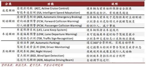 从无自动化到自动驾驶,这一过渡阶段所用的各类驾驶辅助技术均属于 ADAS。 ADAS 可分为速度辅助、制动辅助、车道辅助及其它辅助四类,包括自适应巡航(ACC)、前向碰撞预警(FCW)、行人碰撞预警(PCW)、车道偏离预警(LDW)、盲点探测(BSD)等功能。 目前,全球自动驾驶技术研发尚处早期,量产车大多集中于 L1-L2 阶段, FCW、 PCW和 LDW 是核心焦点。
