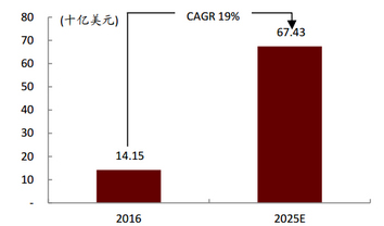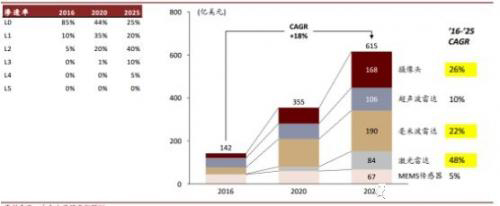 ADAS 的渗透率正快速攀升, IHS 预计 2020 年时全球 ADAS 渗透率将从 2015 年的 10%增至 30%,欧洲地区由于车规要求渗透率更高达 86%。相应的,全球 ADAS 市场不断扩大,据 Grand View Research 统计,全球 ADAS 市场规模将从 2016 年的 141.5 亿美元,增长至2025 年的 674.3 亿美元,年复合增长率 19%。