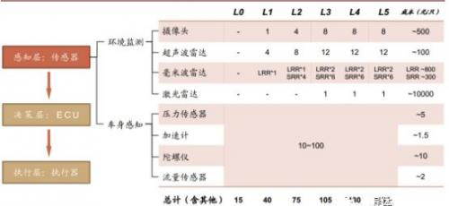 主要汽车传感器在各级 SAE 中的应用