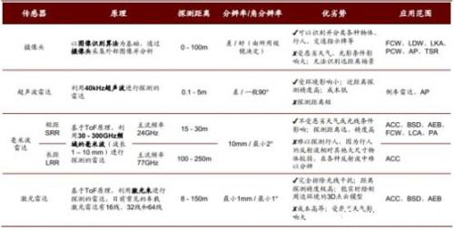 在环境监测传感器中,超声波雷达主要用于倒车雷达以及自动泊车中的近距离障碍监测,摄像头、毫米波雷达和激光雷达则广泛应用于各项 ADAS 功能中。四类传感器的探测距离、分辨率、角分辨率等探测参数各异,对应于物体探测能力、识别分类能力、三维建模、抗恶劣天气等特性优劣势分明。 各种传感器能形成良好的优势互补,融合传感器的方案已成为主流的选择。