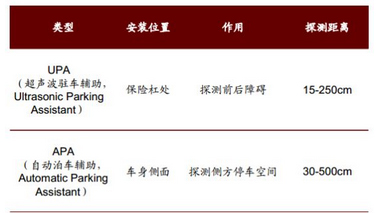 超声波雷达主要应用于倒车雷达,以及自动泊车系统中近距离障碍监测。倒车雷达已经由高端车型下沉到中低端车型,渗透率较高,前装率达 80%左右。倒车雷达系统通常需要 4 个 UPA 超声波雷达,而自动泊车系统需要 6-12 个超声波雷达,典型配臵是 8 个 UPA+4个 APA。 自动泊车系统的普及,将为超声波雷达的增长注入新的动力。