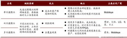 汽车摄像头按视野覆盖位臵可分为前视、环视(侧视+后视)及内视摄像头,其中前视摄像头最为关键,可以实现 LDW、 FCW、 PCW 等功能。前视摄像头又有单目摄像头、双目摄像头,乃至多目摄像头等不同的解决方案。虽然双目或多目摄像头具有更高的测距精度和更广的视角,但由于其成本较高以及对精度和计算芯片的高要求,使得其仍未能大规模量产。目前, 以 Mobileye 领衔的单目摄像头解决方案是市场的主流。