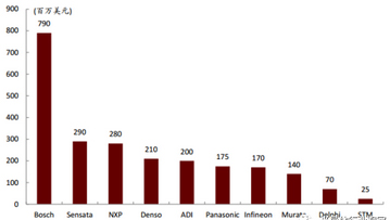 博世是全球 MEMS 传感器龙头企业,与包括 Sensata、NXP (Freescale)、Denso、ADI、Panasonic、Infineon 等在内的国外 Tier 1 或半导体大厂共同垄断了汽车 MEMS 传感器市场。据 IHS统计,全球前十大汽车 MEMS 传感器公司的总市场份额累计超过 85%。