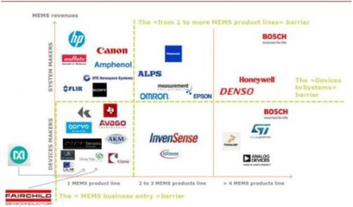 全球 MEMS 厂商竞争坐标:器件 vs. 系统 vs. 产品线
