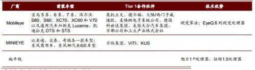 在摄像头模组下游的是车载摄像头解决方案供应商,这类企业的核心技术往往是视觉算法或视觉处理 ASIC 芯片。Mobileye 是全球车载摄像头解决方案龙头,兼具视觉算法和 EyeQ系列视觉处理器核心技术;国内相关初创企业有 MINIEYE、地平线、 中科慧眼、天瞳威视、苏州智华、 纵目科技、 前向启创、创来科技、 Maxieye 等。