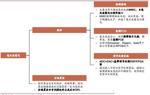 毫米波雷达硬件部分主要由射频前端 MMIC(Monolithic Microwave Integrated Circuit, 单片微波集成电路)、高频 PCB 和信号处理系统组成,每一部分均有较高的技术壁垒,国内较为落后、处于追赶状态;后端算法方面,国内现有技术同样具有局限性,且国外算法受专利保护、价格高昂,其专利授权费约占总成本的 50%。