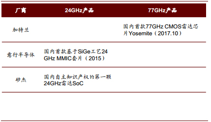 包括 MMIC 创业公司加特兰、意行半导体、矽杰等,毫米波雷达创业公司行易道、安智杰、苏州豪米波、森思泰克、智波科技、隼眼科技、 安智汽车、承泰科技、 纳雷科技、木牛科技、雷博泰克、华域汽车,易来达, 卓泰达、 MotorEye 等。这些企业中,大部分仍处于研发状态,安智杰等公司的 24GHz 产品已实现量产。