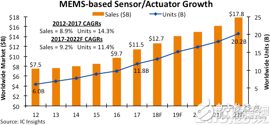 出货量方面也是如此,IC Insights预计2018年MEMS传感器的出货量将会达到111亿颗,比2016年增长19%。