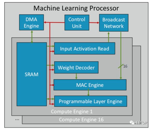 Arm透漏了其首款机器学习芯片计划,将于今年晚些时候在多个市场领域和垂直领域推出。Arm杰出工程师伊恩•布拉特表示:“这是一种新型处理器。”它包括一个基本模块,这是一个计算引擎,加上一个MAC引擎,一个具有控制联合和广播网络的DMA引擎。总共有16个计算引擎,使用7nm工艺技术,在1GHz可以运行4万亿次。