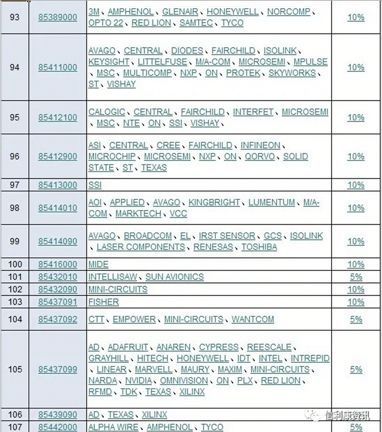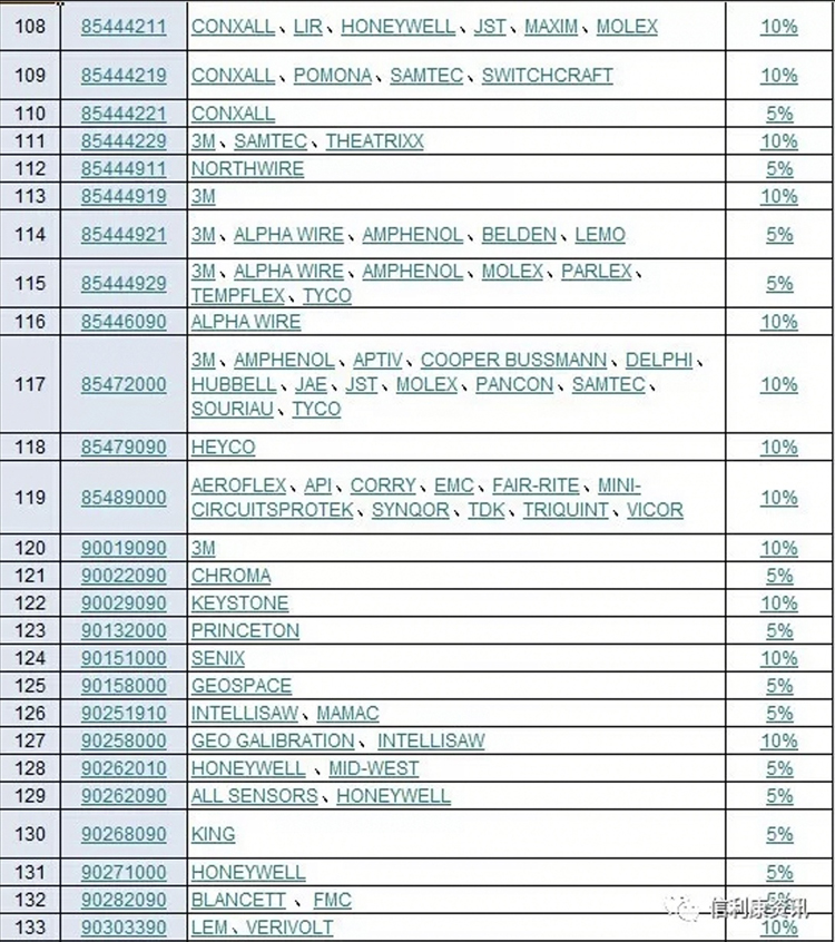 日前,供应链服务公司信利康根据历史自有数据整理分析中,指出此次受影响商品海关编码有143个,涉及商品品牌262个。国际电子商情记者看到,其中包括了CREE,TYCO,3M,MOLEX,安费诺,INTEL,CYPRESS,NXP,MICROSEMI,AVNET,VISHAY,AVX,KEMET,TDK,KINGSTON等等。可以说涉及品牌还是比较多的,但这部分产品涉及进口金额尚未知。