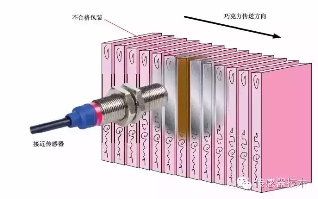 接近传感器内部的能产生交变磁场的线圈,当被检测铁磁物处于该环境下时,便会因电磁感应原理作用而在内部形成涡电流。当涡电流所产生的磁场足够大时便会反过来改变接近传感器原有电路参数,从而产生信号输出。因此,利用接近传感器能识别附近一定范围是否存在含磁性或者易磁化的物质。在一些自动包装过程中,如巧克力金属箔纸包装,通过接近传感器对磁性物质存在性的检测,可以判断是否出现包装错误或工序遗漏的不合格产品,进而提高包装质量。