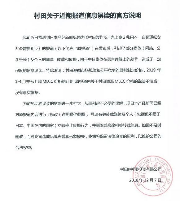 2018年12月7日,村田(中国)投资有限公司发出紧急声明,称 “调涨MLCC价格”的信息并不属实。实则是由于中日媒体在语言理解上的差异,造成了一定程度的信息误读。