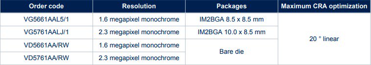 VG5661的分辨率为1.6百万像素(1464 x1104),每秒75帧(fps),采用1/3“光学格式。VG5761的分辨率为2.3 MP(1944 x1204),60 fps,1 / 2.5“光学格式。两者都采用汽车合格的IM2BGA塑料封装。如果首选裸芯片,则可以使用VD5661和VD5761。