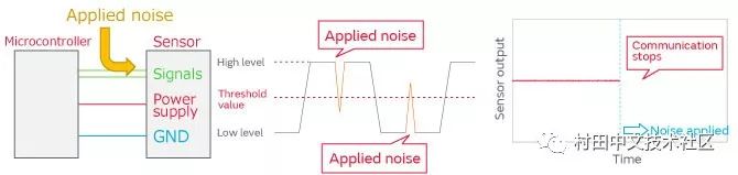 向数字信号线施加噪声时,噪声引起的超过高/低阈值而被误判断时,无法正常通信从而发生误操作。