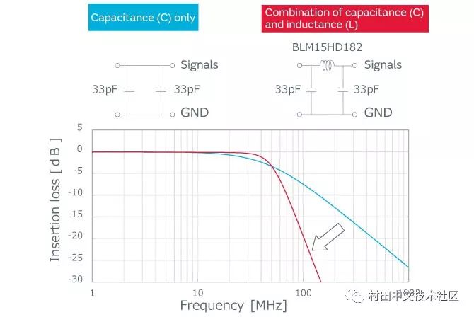 噪声级别小或信号和噪声的频率相差大的情况下,可以只用电容器进行降噪,但如果信号频率和噪声频率相近时,需要电感器和电容器组合来构成插入损耗陡峭的滤波器。