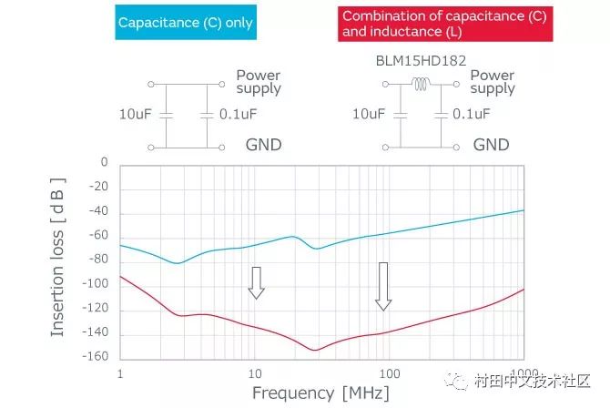 仅使用电容器的情况下,需要低频端的大容量电容器和为获得高频端插入损耗的低ESL电容器。