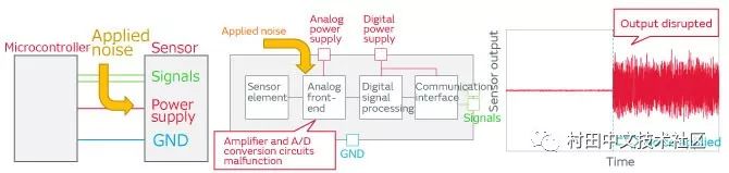 以上这样,One chip传感器的信号线或电源线施加噪声时,会发生通信停止或输出值紊乱的误操作。