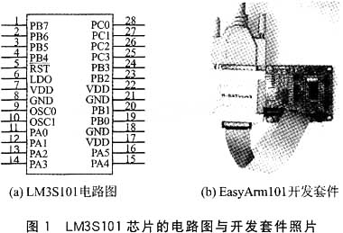 图1是LM3S101 芯片电路图和EasyArm101开发套件实物图。