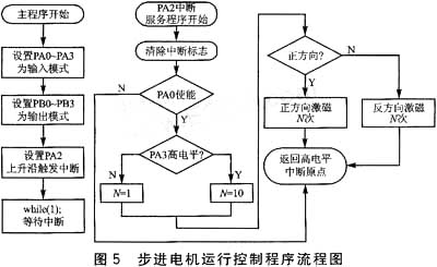 程序流程图如图5所示。主程序等待输入控制信号触发外部中断,每次中断转动N个步距角,其判断过程由中断服务程序实现。